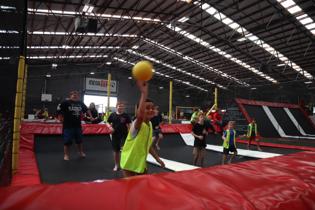 Children playing dodgeball in trampoline arena at Mega Air Holiday Programme